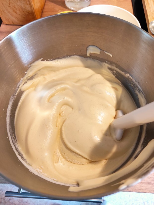 - Fouettez le sucre et les œufs entiers dans votre robot pendant 5 mn à vitesse max , puis à vitesse moyenne pendant 15mn ( mon robot c’est arrêté avant ) la préparation va tripler de volume