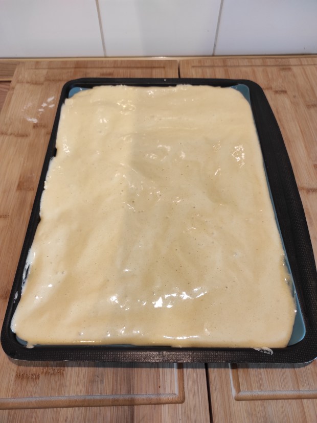 4. Versez la génoise sur la plaque ( j’ai posé un tapis de cuisson en silicone sur ma plaque que j’ai beurré pour ne prendre aucun risque 😅 ) bien étaler la pate avec la spatule