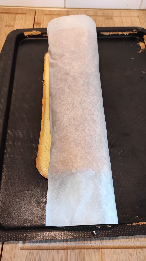 Pour ma part, j’ai retourné le biscuit sur du papier sulfurisé et j’ai roulé le gâteau avec.